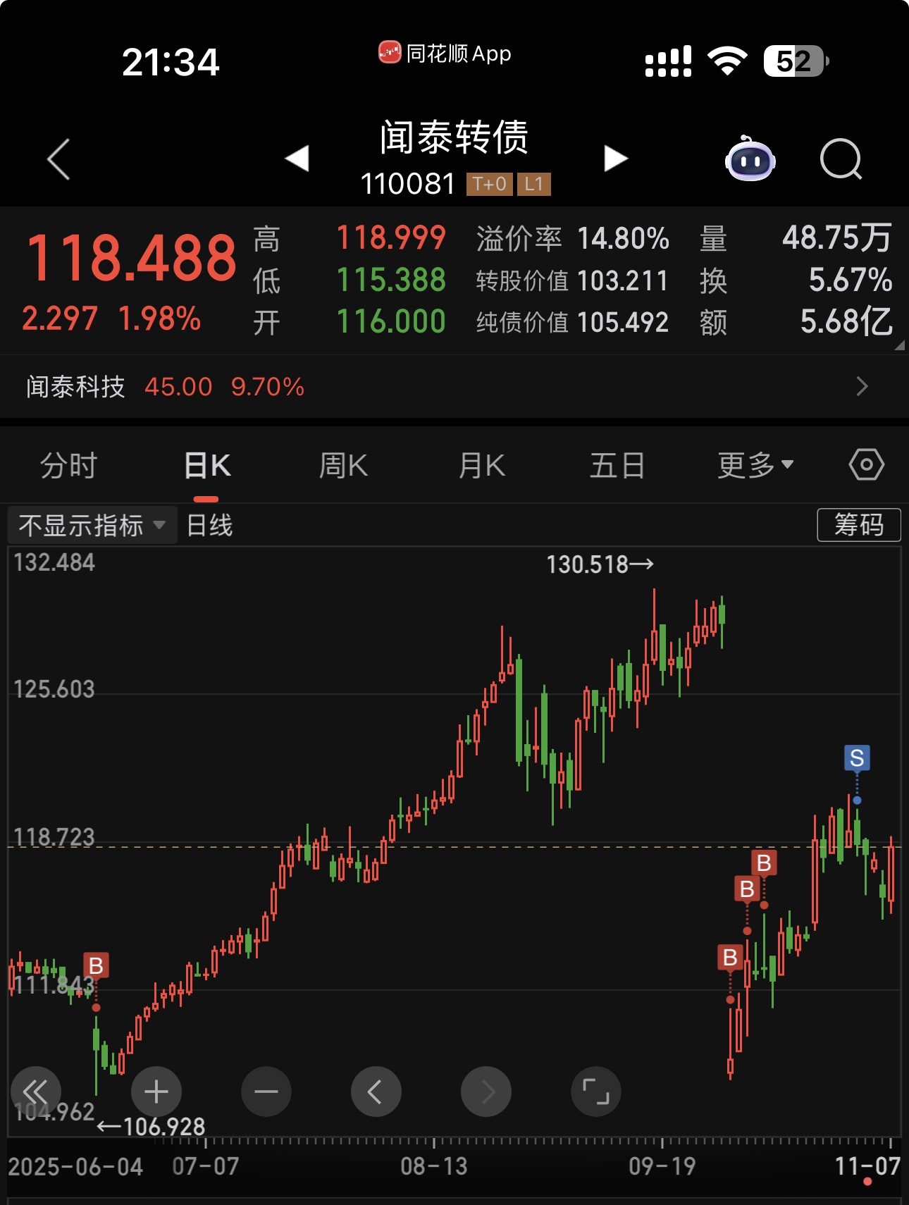 我持有闻泰转债,年中时买入,之后因为安世半导体的事件加仓。前几天价格上涨后卖出了加仓的部分,相当于做了个 T,目前持仓成本非常低。