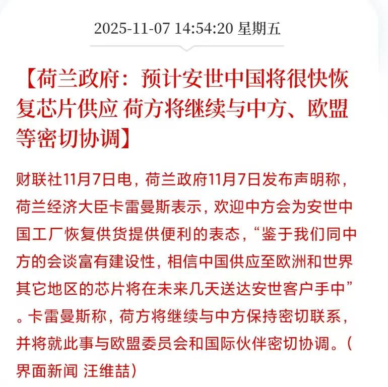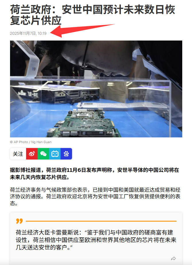 晚上,我看到一位群友发的俄罗斯卫星通讯社早上 10 点 19 分的新闻,也是关于这件事。新闻标题是《荷兰政府:安世中国预计未来数日恢复芯片供应》。